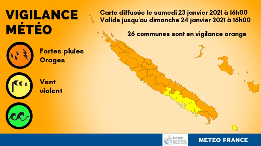 - Météo NC a placé l’ensemble du pays, excepté l’île des Pins et les communes de Nouméa à Moindou, en vigilance orange fortes pluies et orages : risque de pluies fortes et parfois orageuses. Vingt-six communes sont concernées. Vigilance jaune Vent Fort sur Bélep, Ouvéa, Lifou, l’îleIl vous reste 75% de l'article à découvrir.Cet article est réservé aux abonnés.