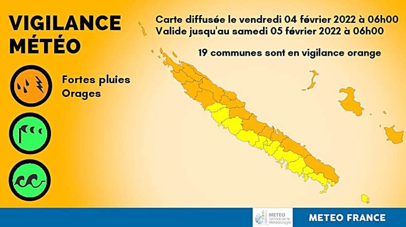 Si la dépression tropicale, actuellement centrée à plus de 280 kilomètres au nord-ouest de Bélep est faible, elle apporte sur le Caillou un flux d’air chaud instable. En conséquence, Météo France prévoit une vigilance orange fortes pluies et orages, sur 19 communes de la côte est, du sud au nord, et sur les Loyauté, jaune partout ailleurs.