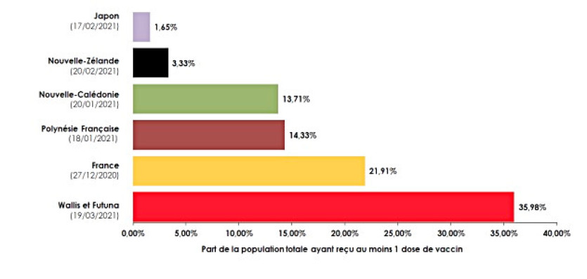 La Dass indique que la Nouvelle-Calédonie fait des premiers territoires du Pacifique à se faire vacciner. A titre de comparaison, seul 3,33 % de la population néo-zélandaise a reçu au moins une dose (13,71 % en Calédonie).