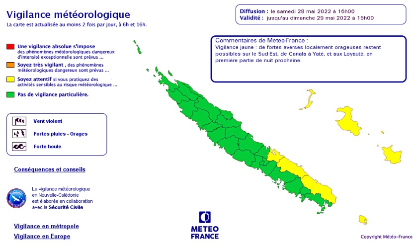 Seules les communes de Canala à Yaté, ainsi que l’île des Pins et les trois îles des Loyauté sont maintenues en vigilance jaune jusqu’à dimanche matin.