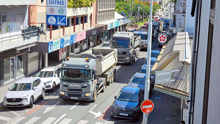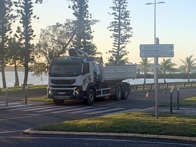 Comme annoncé, plusieurs camions se sont installés au petit matin devant le Congrès, boulevard Vauban. Photo J.-F.G.Ils sont positionnés sur plusieurs points de la capitale et de la Grande Terre. Les rouleurs attendaient d’une minute à l’autre l’ordre de mettre en place les barrages filtrants.