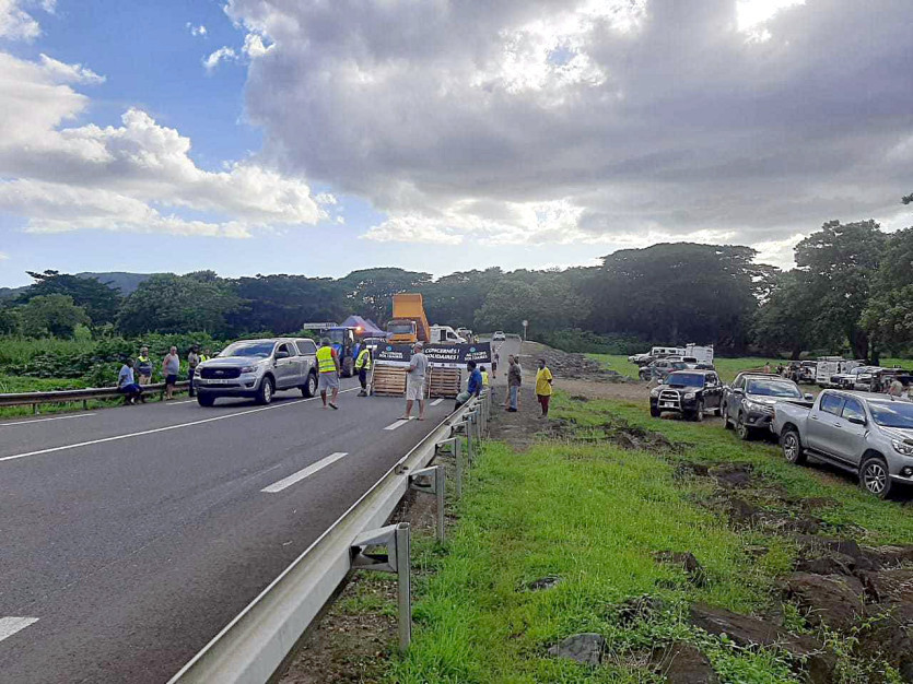 La sortie nord de Bourail est bloquée à la circulation. Photo Nadège Bège[MàJ 11h45] Les rouleurs restent stationnés devant le gouvernement mais il y a moins de personnes devant le gouvernement. L’ambiance est restée calme ce matin.