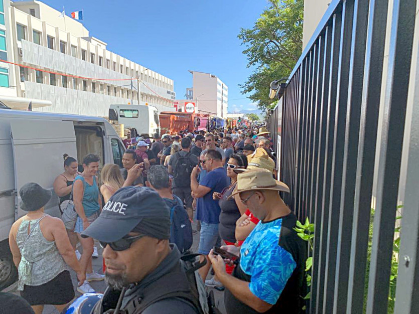 Il y a moins de monde devant le gouvernement ce midi. Photo DR[MàJ 11h30] Ils étaient 1 500 personnes réunies au pied du gouvernement, au plus fort de la mobilisation, pour demander le retrait du Congrès du texte sur le Ruamm. A quelques mètres, une soixantaine de personnes sont réunies pour apporter leur soutien au gouvernement Mapou.