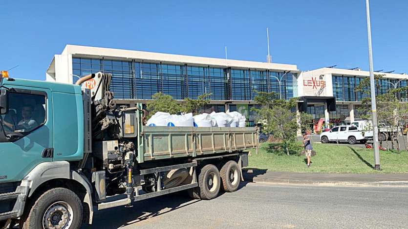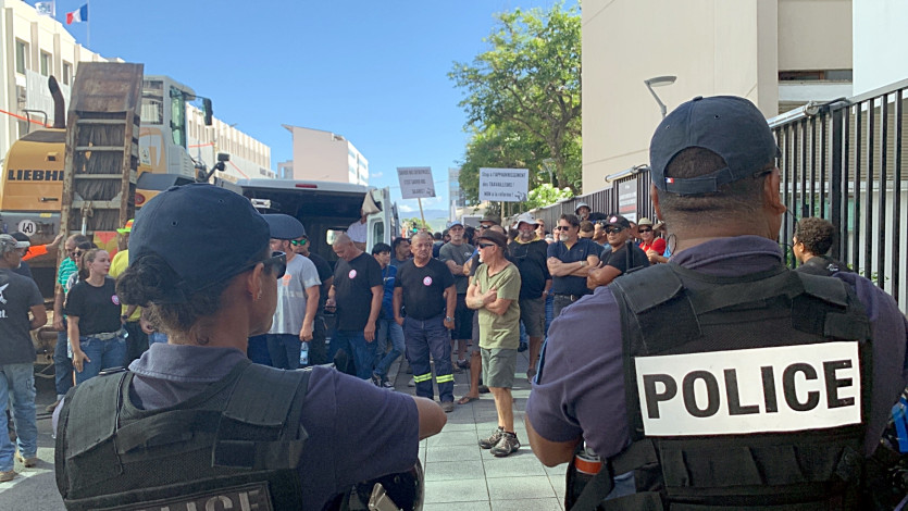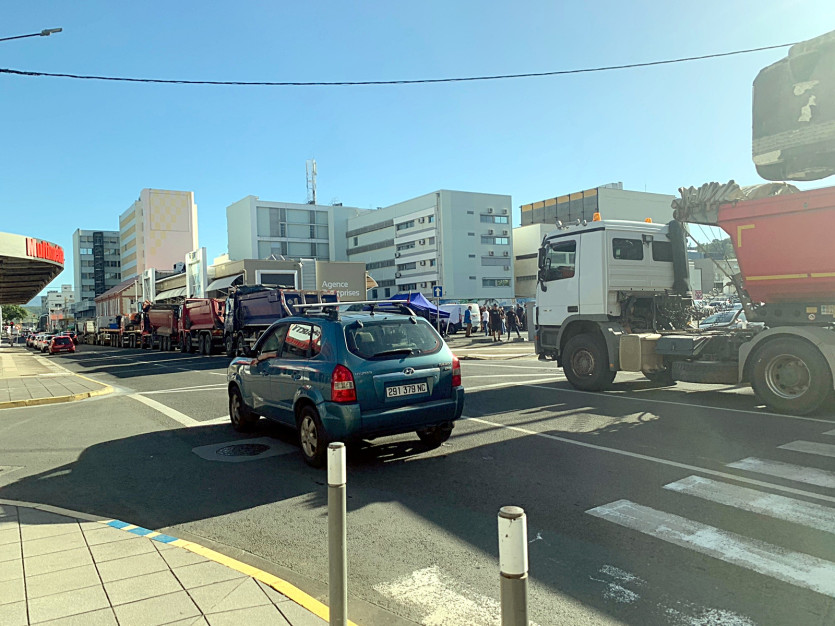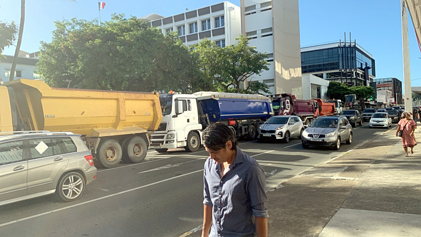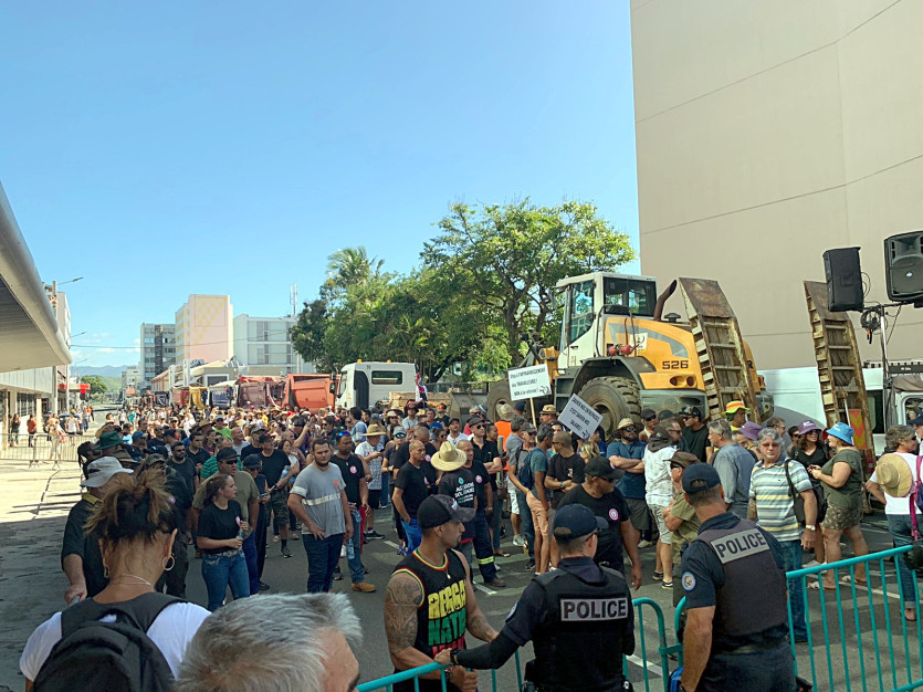 Minutes après minutes, de plus en plus de monde se rassemble devant le gouvernement. Photo Delphine Bossy[MàJ 8h30] Le rassemblement pour demander le retrait de la proposition de loi sur l’uniformisation du taux de cotisation à 13,5 % pour les salariés et les travailleurs indépendants est lancé. Dès 4 heures du matin, des camions, 13 pour l’instant, du syndicat des rouleurs et du BTP se sont installés autour du gouvernement. Une cinquantaine de camions à Nouville. Ils affichent leur détermination pour le retrait du texte et sa reprise par le gouvernement. Selon les avancées de la journée, " peut-être préparez-vous à faire du carburant, peut-être préparez-vous à ce que Nouméa ou peut-être même à ce que le pays soit bloqué " lance Christophe Ramadi, syndicat des rouleurs du BTP.