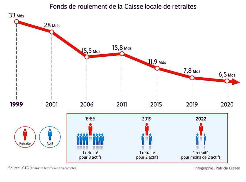 En 2019, les cotisations versées à l’établissement ont atteint 17,02 milliards de francs sur un total de recettes budgétaires de 17,03 et les pensions 17,83 milliards sur un total de dépenses budgétaires de 17, 98 milliards. En l’état, les difficultés de trésorerie surviendront dès 2022 si aucune mesure n’est prise. Une gestion épinglée par un rapport de la Chambre territoriale des comptes en mars.