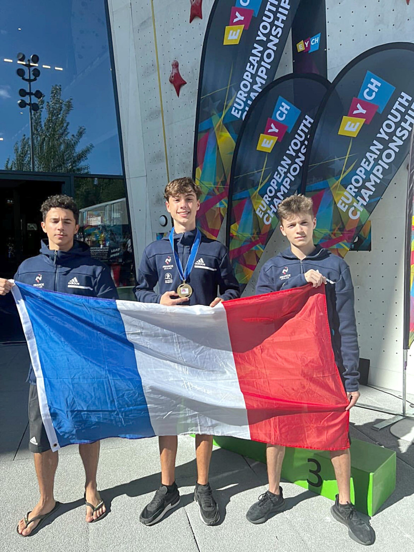 - Anthony Fillet | Crée le 11.07.2022 à 06h05 | Mis à jour le 11.07.2022 à 06h35ImprimerPaco (au centre) repart d’Allemagne avec une médaille du plus beau métal et un grand sourire. Photo Pôle espoir escalade NCLa compétition avait lieu à Augsbourg, en Allemagne, dans la nuit de dimanche à lundi. Trois grimpeurs du Caillou étaient avec l’équipe de France.