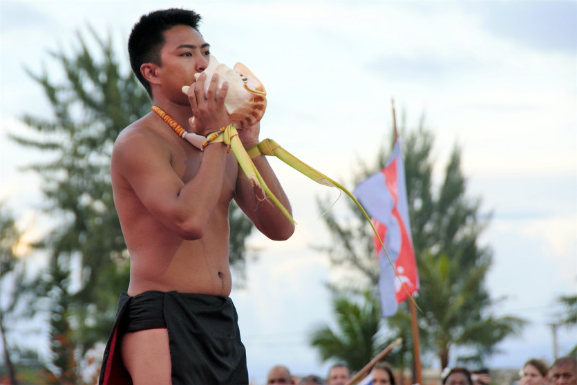 La toutoute, instrument bien connu, a résonné à plusieurs reprises dans le stade de Saïpan, juste devant le drapeau du mouvement sportif calédonien. Photo Claire Gaveau