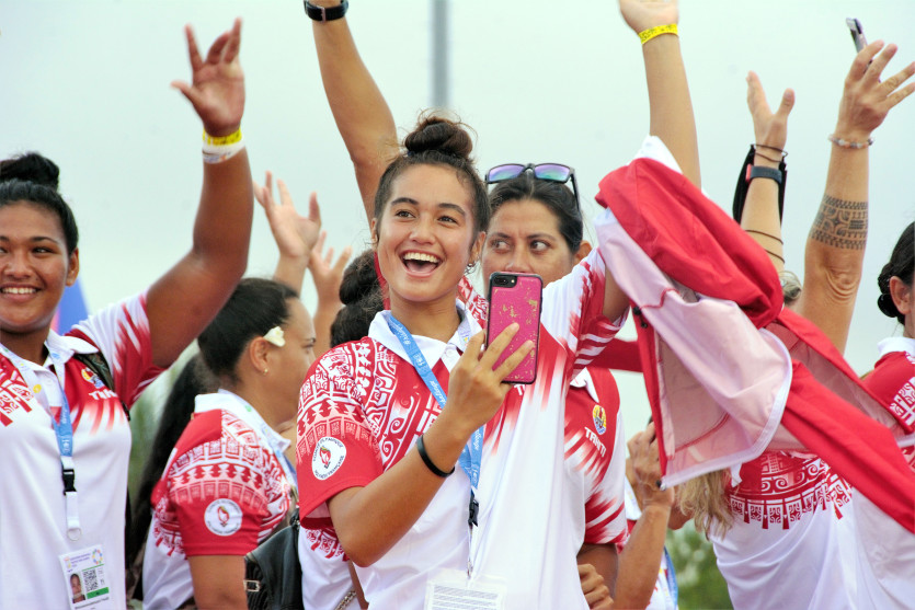 Pour garder un maximum de souvenirs, certains sportifs, ici de Polynésie, ont sorti leur téléphone. Sans oublier malgré tout de partager ce moment avec leurs coéquipiers et le public présent en nombre autour du stade. Photo Claire Gaveau