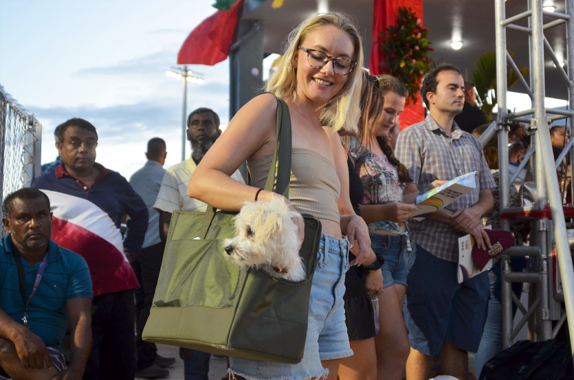 Les Minijeux du Pacifique sont l’événement de l’année à Saïpan, l’île principale des Mariannes du Nord. Les habitants ne voulaient donc pas manquer la cérémonie d’ouverture. Kelly est venue avec son chiot de 6 mois, Holly. Photo Anthony Fillet