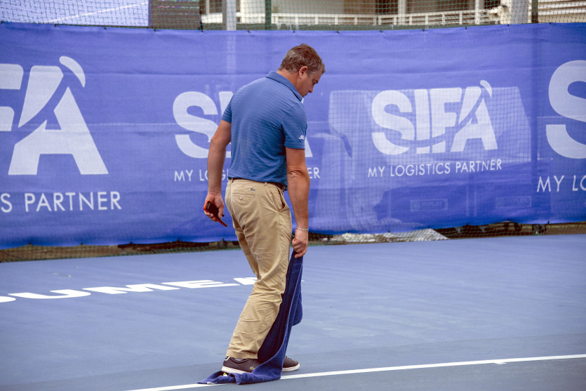 L’arbitre a plusieurs fois essuyé les lignes de terrain, quand il ne pleuvait alors pas fort. Photo Thierry PerronÀ ce moment-là, l’Italien Raul Brancaccio, 25 ans, venait de prendre l’avantage dans le deuxième set, 6-5. Un soulagement pour lui, car son adversaire, Laurent Lokoli, 28 ans, a eu une balle de match à 5-4, 40-30.