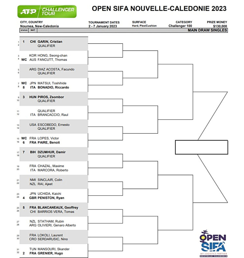 - Anthony Fillet anthony.fillet@lnc.nc | Crée le 01.01.2023 à 07h30 | Mis à jour le 01.01.2023 à 09h10ImprimerVictor Lopes a joué pour la Calédonie en juin aux Mariannes du Nord, atteignant les quarts de finale en simple. Photo Anthony FilletLe tirage au sort de l’Open Sifa Nouvelle-Calédonie 2023 s’est déroulé samedi soir. Il a révélé de belles surprises.