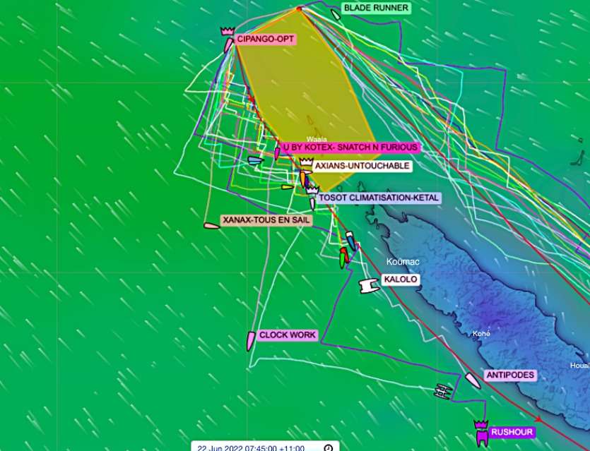 - Titouan Moal | Crée le 21.06.2022 à 23h05 | Mis à jour le 22.06.2022 à 08h05ImprimerRushour est toujours en tête. Photo YB Tracking Race ViewerGrands bords au large ou petits zigzags le long du récif, les 19 bateaux qui naviguent actuellement vers le Sud ont opté pour des tactiques différentes sur la côte Ouest. Mais Rushour continue d’ouvrir la route, seul en tête.