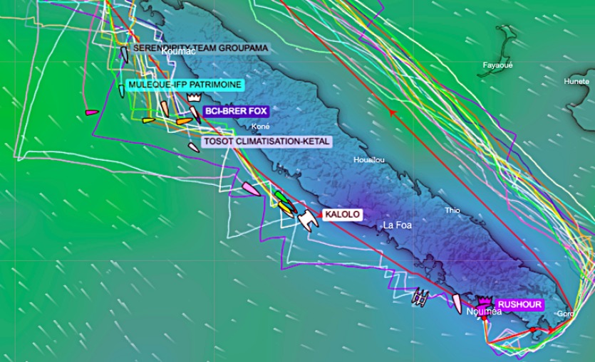 Un peu plus loin, le petit groupe de Calédoniens : le catamaran Kalolo, les trois Sydney 38 (Poulpito, Eye Candy et Guilty Pleasures) ainsi que Motorboat II, Clockwork et l’Australien Wings forment une flotte relativement compacte et se trouvent entre Poya et Bourail. Ils profitent d’un vent légèrement plus Est que Sud-Est pour tirer un long bord vers Nouméa. Selon les dernières estimations, les premiers devraient être à bon port dans l’après-midi.
