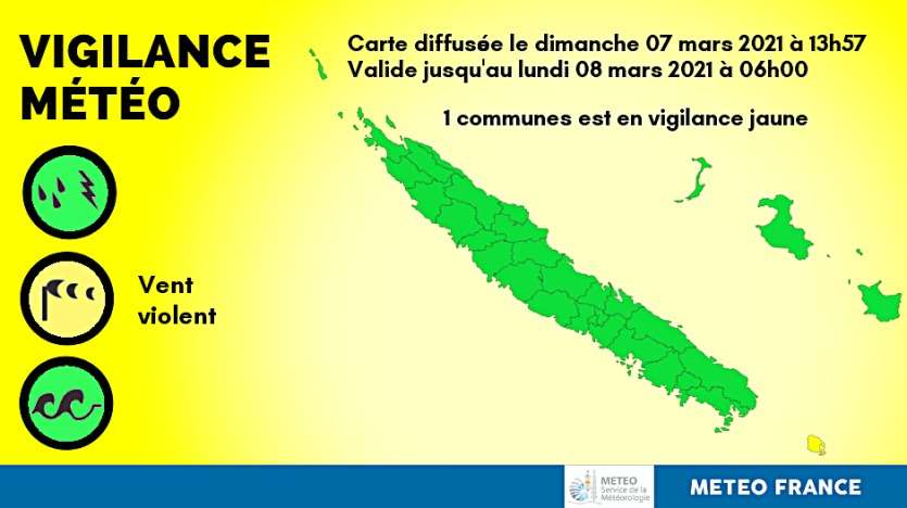 - | Crée le 07.03.2021 à 15h15 | Mis à jour le 07.03.2021 à 15h29ImprimerL'Île des Pins est la seule commune concernées par une vigilance jaune. Photo Météo NC