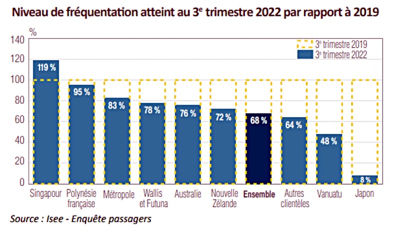 La clientèle en provenance de la Métropole reste toujours majoritaire alors que les Nippons, eux, boudent le territoire, puisque seuls 390 touristes japonais se sont rendus sur le Caillou contre 4900 touristes en 2019 à la même période. Photo IseeÀ l’inverse, Les Nippons, eux, boudent le territoire puisque seuls 390 touristes japonais se sont rendus sur le Caillou au 3e trimestre contre 4900 touristes en 2019 à la même période. La clientèle en provenance de la Métropole, elle, reste toujours majoritaire (40 % de l’affluence) et les touristes Singapouriens se déplacent désormais en plus grand nombre depuis le premier vol inaugural entre Nouméa et Singapour le 1er juillet dernier, même s’ils ne représentent encore que 0,5 % du marché touristique calédonien.