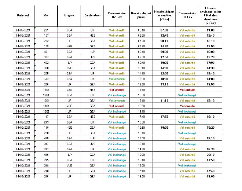 Le programme de vol d’Air Calédonie du jeudi 4 février, établi ce mercredi soir. Image Air Calédonie"On a tout resserré sur l’après-midi. C’est ambitieux mais on doit tenter le tout pour le tout", précise Marion Gentelet. Si un vol prend du retard, les suivants auront de bonnes chances d’être décalés ou annulés.