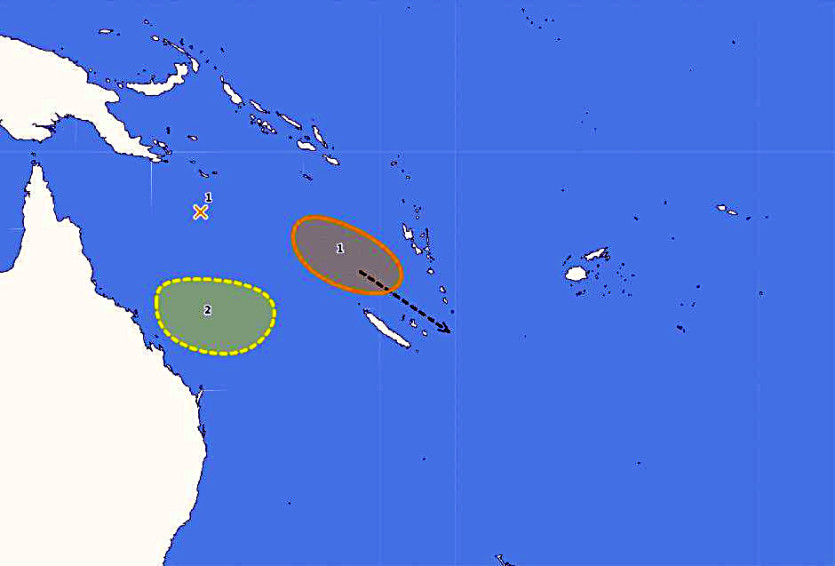 "La première dépression devrait circuler entre les îles Loyauté et le Vanuatu entre vendredi et samedi. Selon les prévisions actuelles, la Nouvelle-Calédonie resterait à l’écart des vents violents, mais un épisode pluvio-orageux pourrait concerner le pays. Cette dépression est à surveiller en raison de sa proximité avec le territoire", souligne les météorologues.