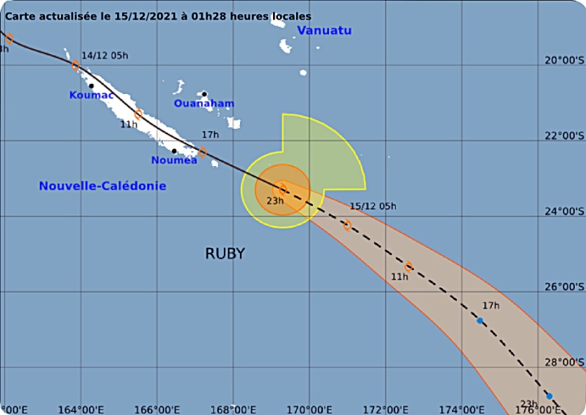 - B.B. | Crée le 15.12.2021 à 07h30 | Mis à jour le 15.12.2021 à 07h48ImprimerCarte de la trajectoire de Ruby mis à jour par Météo-France NC à 1 heure du matin, le 15 décembre. Carte Météo-France NCLa dépression tropicale forte Ruby n’a jamais passé le stade de cyclone. Selon le dernier bulletin de Météo-France NC, 200 à 400 mm de pluies ont été enregistrés entre Houaïlou et Yaté.