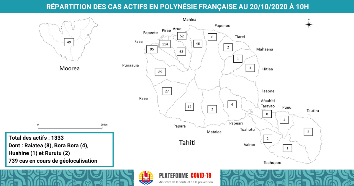 D'après la carte diffusée par le Ministère de la santé et de la prévention, les autorités ont identifié 49 cas actifs à Moorea, 8 à Raiatea, 4 à Bora Bora, un à Huahine et un également à Rurutu, aux Australes. Et 739 cas sont en cours de géolocalisation selon la direction de la Santé.