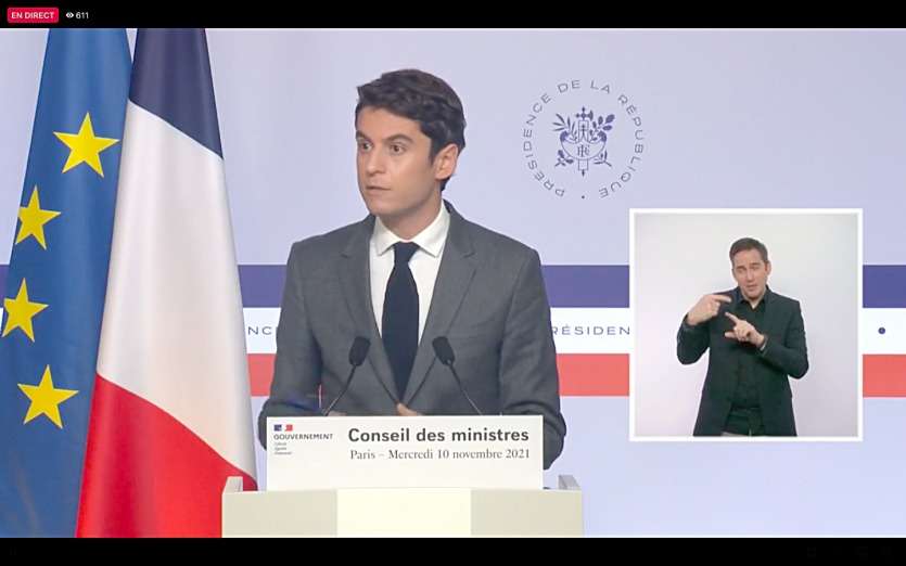 - Jean-Alexis Gallien-Lamarche | Crée le 10.11.2021 à 23h40 | Mis à jour le 10.11.2021 à 23h41ImprimerGabriel Attal Capture d'écranLe porte-parole du gouvernement Gabriel Attal s’est exprimé mercredi 10 novembre à l’issue du Conseil de défense sanitaire et du Conseil des ministres.