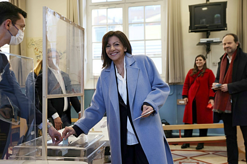 La candidate PS Anne Hidalgo dépose son bulletin dans l’urne dans un bureau de vote à Paris, le 10 avril 2022.