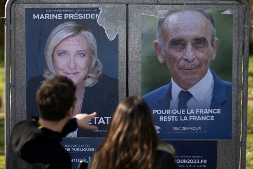 La candidate du RN à la présidentielle Marine Le Pen et le candidat du parti Reconquête Eric Zemmour sur des affiches de la campagne à Montaigu le 2 avril 2002
