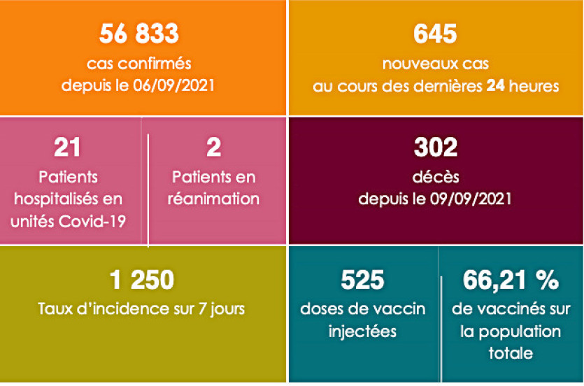 Hier, jeudi 3 mars, 525 personnes ont reçu une injection. Depuis le début de la campagne : 187 783 personnes ont reçu au moins une dose de vaccin ; soit 81,15 % de la population vaccinable et 69,29 % de la population totale; 179 420 personnes ont reçu deux doses de vaccin, soit 77,54 % de la population vaccinable, 66,21 % de la population totale ;