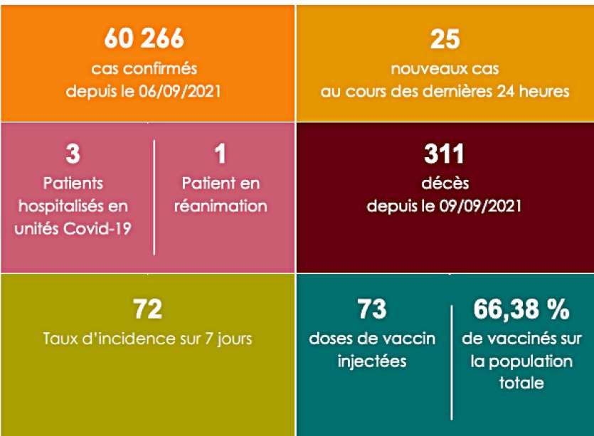 Le point sanitaire émis par le gouvernement mercredi fait état de 25 cas détectés au cours des dernières vingt-quatre heures. Ce qui porte le nombre total de cas depuis l'entrée du virus sur le caillou à 60 266. Il restait mercredi 350 cas actifs. Toujours en baisse, le taux d'incidence qui était de 81 pour 100 000 habitants s'établit désormais à 72. Il ne restait mercredi qu'une seule personne prise en charge en service de réanimation et trois en unité Covid. Aucun décès n'est à déplorer pour cette journée. 59 631 personnes sont considérées comme guéries. Enfin, 73 personnes ont reçu une injection de vaccin depuis mardi.