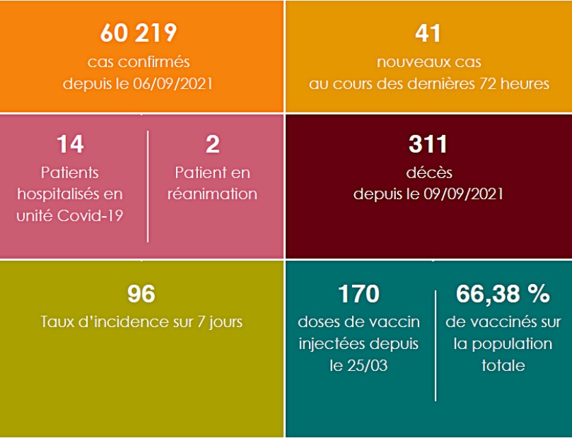 Au cours des soixante-douze dernières heures, 41 nouveaux cas ont été confirmés, ce qui porte leur nombre total à 60 219, dont 404 cas actifs.