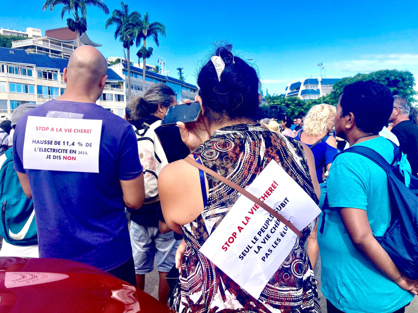 Brandi comme une banderole ou accroché aux t-shirts, un seul et même mot d’ordre : "Stop à la vie chère". Pour sa deuxième mobilisation, l’Association citoyenne de Nouvelle-Calédonie a réuni, à la Moselle, entre 100 et 150 personnes ce samedi, venues exprimer leurs difficultés à faire face à un coût de la vie toujours plus élevé.