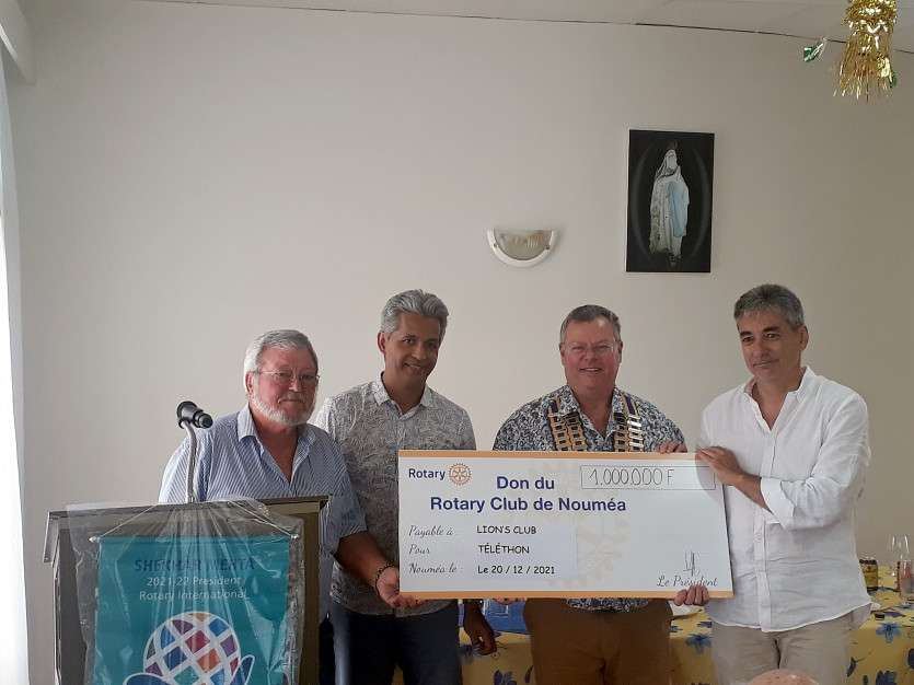 - B.B. | Crée le 21.12.2021 à 14h05 | Mis à jour le 21.12.2021 à 14h20ImprimerLa 27e édition du Téléthon a été perturbée par la crise sanitaire. Photo DRLe Rotary club de Nouméa a donné un chèque d’un million de francs à l’association Téléthon de Nouvelle-Calédonie pour aider la recherche sur les myopathies.
