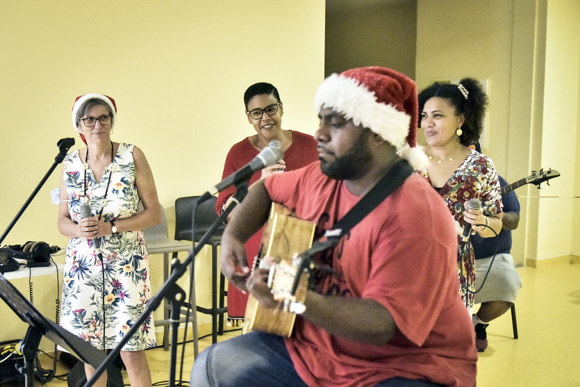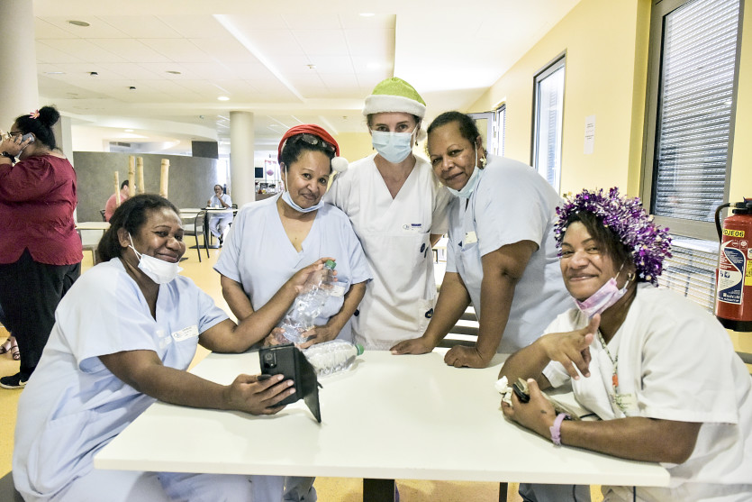 Isabelle Molo (à gauche) a monté un quatuor avec ses collègues de pédiatrie spécialement pour l’occasion. Photo Nicolas PetitLa plupart de ces animations étaient également proposées aux patients et aux visiteurs, contraints de rester loin de leur famille en cette période de fêtes. Une attention particulièrement appréciée : "On a dû évasaner mon fils, mardi, donc on est à l’hôpital pour Noël, confie Pierre Mindia, d’Ouvéa. Ces concerts permettent aux malades de ne pas se sentir oubliés. Je pense notamment à tous les patients des îles comme nous qui ne pourront pas voir leurs proches. Et en plus, on voit que ça remotive les soignants."
