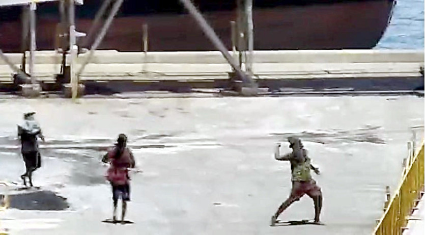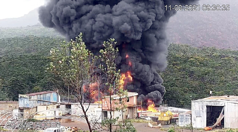 Des jets de pierres et de plombs de pêche depuis le quai vrac. Photo Vale"Sur terre", on voit d’anciens bâtiments de mine, près de la rivière Kwé, en feu.