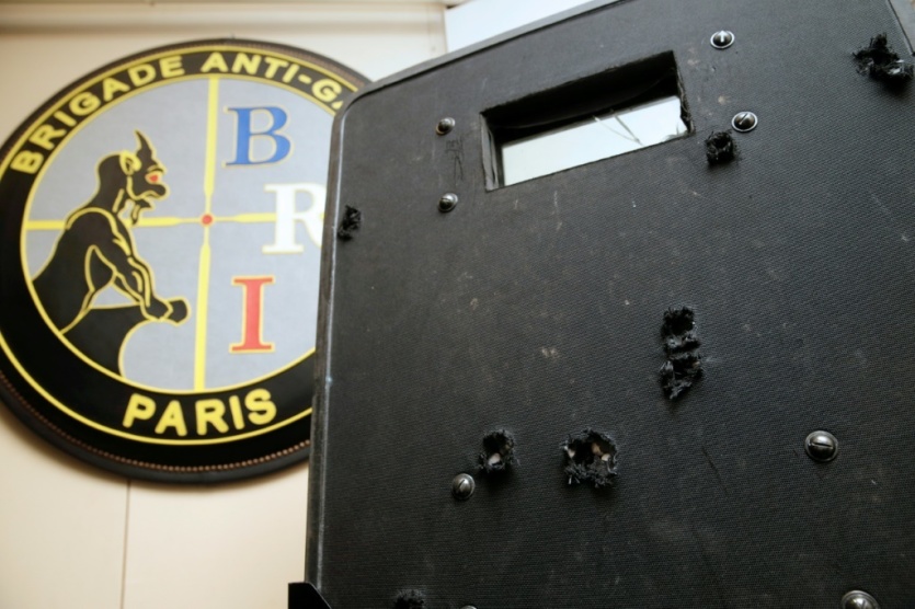 Le bouclier utilisé lors de l'assaut du Bataclan, criblé d'impacts, présenté au siège de la BRI, le 17 novembre 2015 à Paris Kenzo TRIBOUILLARD [AFP/Archives]