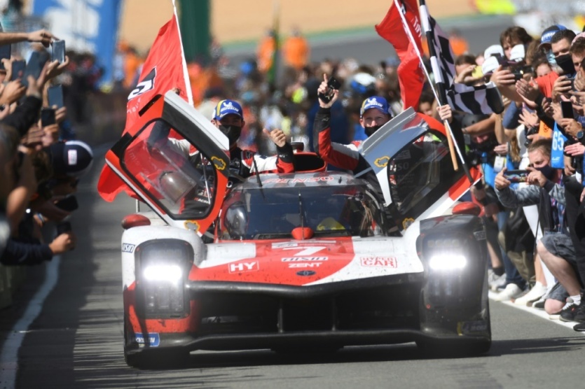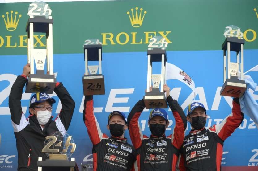 - | Crée le 23.08.2021 à 05h14 | Mis à jour le 23.08.2021 à 06h14ImprimerLe président de l'écurie Gazoo Racing, le Japonais Shiegeki Tomoyama (g), célèbre la victoire aux 24 Heures du Mans, de la Toyota N.7, pilotée par le Britannique Mike Conway, le Japonais Kamui Kobayashi et l'Argentin José Maria Lopez, le 22 août 2021 JEAN-FRANCOIS MONIER [AFP]En-fin ! Malchanceuse en 2017, 2019 et 2020, la Toyota N.7 du Britannique Mike Conway, du Japonais Kamui Kobayashi et de l'Argentin José Maria Lopez a fini par remporter les 89e 24 Heures du Mans devant 50 000 spectateurs, dimanche, malgré une grosse frayeur.