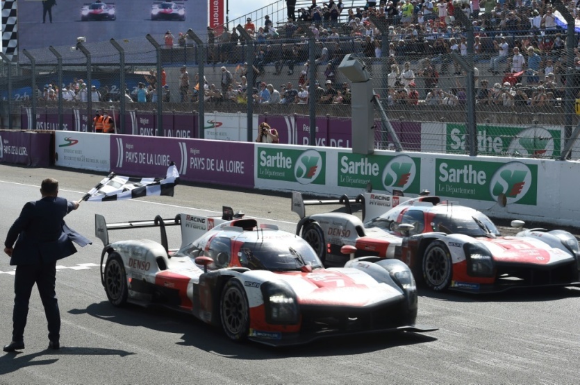 Le directeur des 24 Heures du Mans, Patrick Morisseau agite le drapeau à damiers, après la victoire de la Toyota n°7, pilotée par le Japonais Kamui Kobayashi, devant l'autre Toyota n°8, pilotée par le Japonais Kazuki Nakajima, le 22 août 2021 JEAN-FRANCOIS MONIER [AFP]