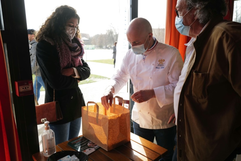 Le chef étoilé Olivier Nasti (c) distribue des repas à emporter aux étudiants de sa ville, à Colmar, le 24 février 2021 SEBASTIEN BOZON [AFP]