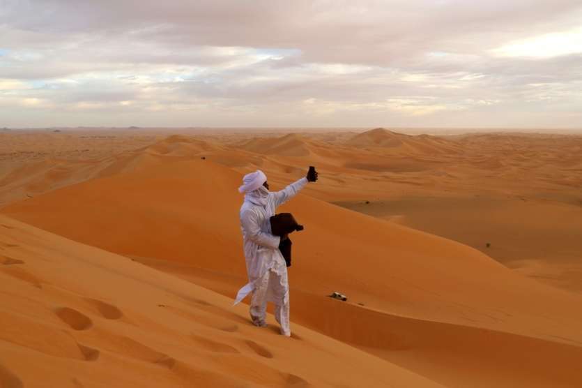 - | Crée le 09.12.2022 à 09h55 | Mis à jour le 09.12.2022 à 19h55ImprimerUn touriste prend un selfie le 3 décembre 2022 sur les dunes de Chiriet, au nord-est d'Iférouane, au Niger Souleymane Ag Anara [AFP]Ni les secousses du pick-up slalomant sur les pistes sahariennes du nord du Niger, ni la poussière brunissant peu à peu son habit bleu turquoise, n'ont entaché la joie d'El Gondj Ahmed quand les lumières de l'oasis d'Iférouane sont apparues dans la nuit claire.