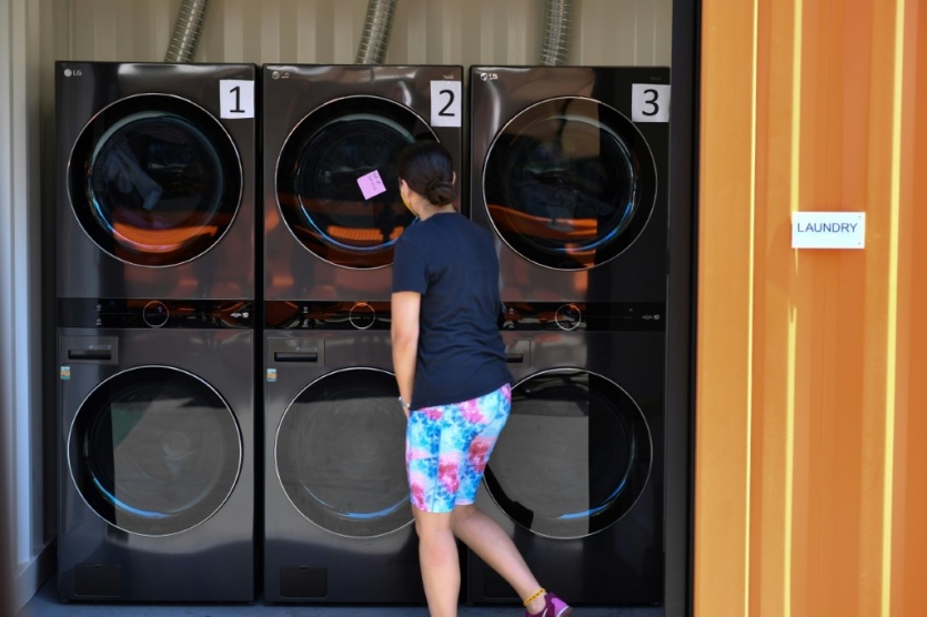 Une laverie à disposition des résidents des "mini-maisons" du quartier de Tarzana, le 9 juillet 2021 à Los Angeles Robyn Beck [AFP]