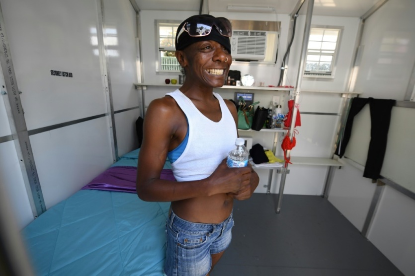Zuri-Kinshasa Maria Terry, 46 ans, s'est installée dans une des mini-maisons de Tarzana la veille. Elle dit s'être retrouvée à la rue il y a un an, après avoir passé deux semaines en soins intensifs à cause du Covid-19.