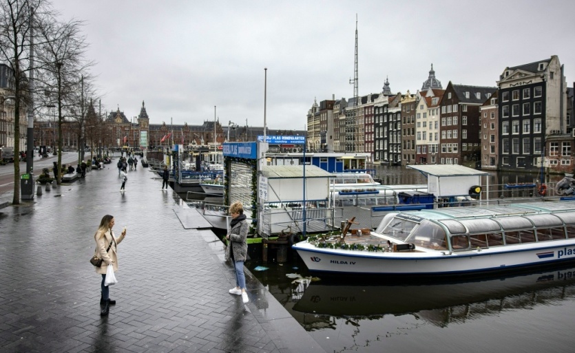 Quelques personnes devant des bateaux touristiques fermés à Amsterdam pour cause de "confinement" aux Pays-Bas, le 19 décembre 2021 Ramon van Flymen [ANP/AFP]MERCI DE VOUS IDENTIFIER