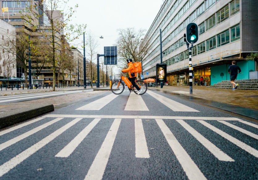 Un livreur à vélo sur une route déserte à Rotterdam au premier jour de "confinement" aux Pays-Bas, le 19 démcebre 2021 Marco de Swart [ANP/AFP]
