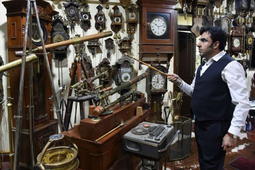 Le collectionneur et policier Gul Kakar montre ses horloges anciennes conservées au quartier général de la police à Quetta, le 26 novembre 2021 au Pakistan Banaras KHAN [AFP]