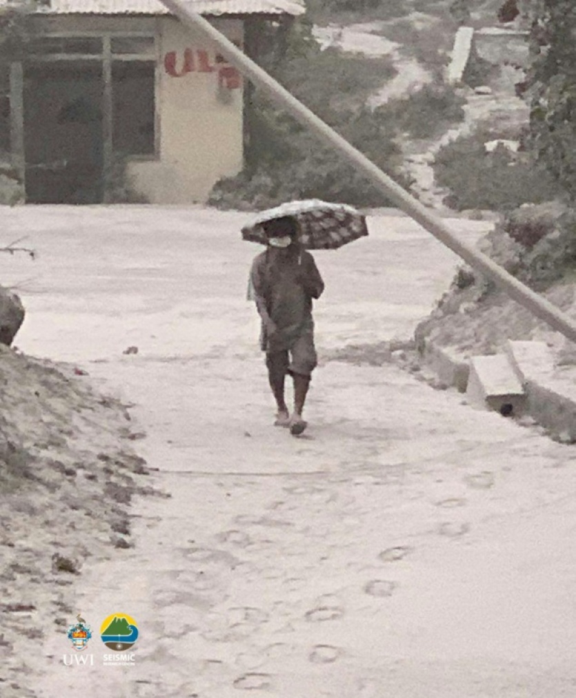 Une habitante de Saint-Vincent sous la cendre provoquée par l'éruption de la Soufrière, le 10 avril 2021 - [UWI Seismic Research Centre/AFP]