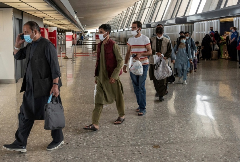 Des Afghans à leur arrivée à l'aéroport de Dulles, après leur évacuation, le 23 août 2021 en Virginie ANDREW CABALLERO-REYNOLDS [AFP]