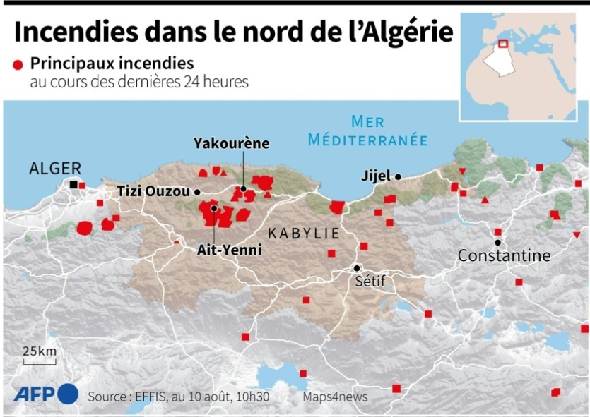 Ces incendies, pour lesquels les autorités ont évoqué des pistes "criminelles", touchent plusieurs régions de Kabylie, dont Tizi Ouzou, et des images impressionnantes --accompagnées d'appels à l'aide-- circulent sur les réseaux sociaux, avec des troncs calcinés, du bétail agonisant, asphyxié, et des villages assiégés.