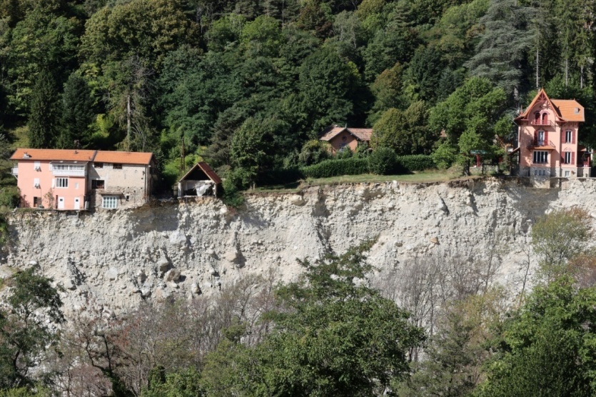 Maisons endommagées ou très menacées par les affaissements de terrain provoqués un an auparavant par les inondations de la vallée, à Saint-Martin-Vésubie, le 21 septembre 2021 Valery HACHE [AFP/Archives]