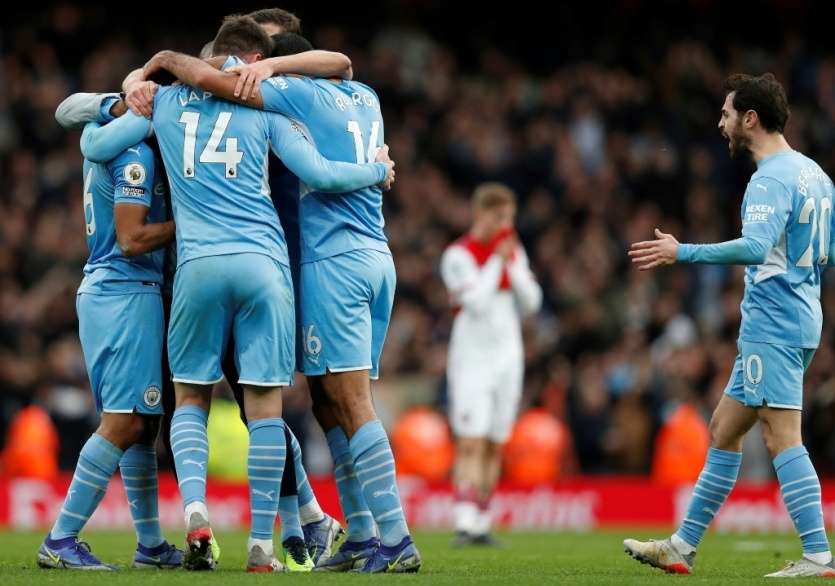 - | Crée le 01.01.2022 à 21h48 | Mis à jour le 02.01.2022 à 07h48ImprimerLa joie des joueurs de Manchester City après le but de Rodri contre Arsenal en Premier League le 1er janvier 2022 à Londres Adrian DENNIS [AFP]Manchester City, malmené pendant une heure par Arsenal, a remporté une victoire in extremis sur la pelouse d'Arsenal (2-1) et Tottenham en a fait de même dans le temps additionnel à Watford (1-0), samedi lors de la 21e journée du Championnat d'Angleterre.