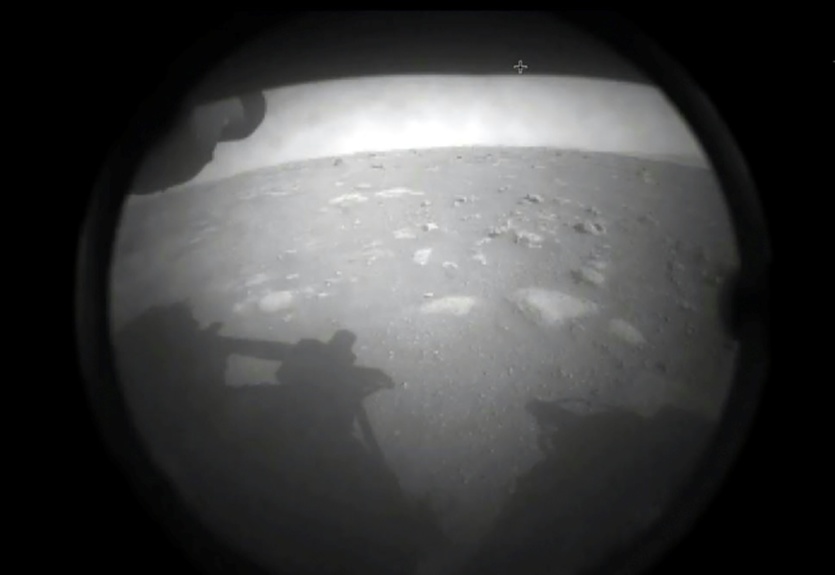 - | Crée le 18.02.2021 à 14h37 | Mis à jour le 19.02.2021 à 16h38ImprimerL'une des deux premières photos prises par le rover de la Nasa Perseverance après avoir réussi son atterrissage sur Mars, sur laquelle on peut voir l'ombre du véhicule projetée au sol Handout [NASA/AFP]La Nasa a brillamment réussi jeudi à poser sur Mars son rover Perseverance, le cinquième véhicule seulement à avoir réussi le voyage sans encombre, mais le premier à afficher comme objectif de trouver, dans les années à venir, une preuve de vie passée sur la planète rouge.