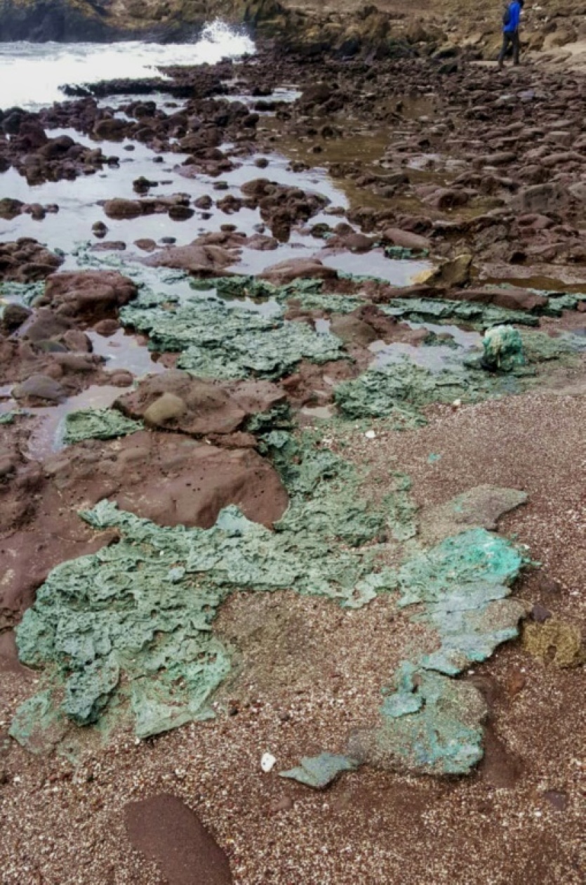 Elle a vu pour la première fois ces croûtes verdâtres sur environ 12 m2 de formations rocheuses en 2019, sur la plage des Tortues, la plus grande réserve écologique au monde pour la ponte des tortues vertes, espèce marine menacée.